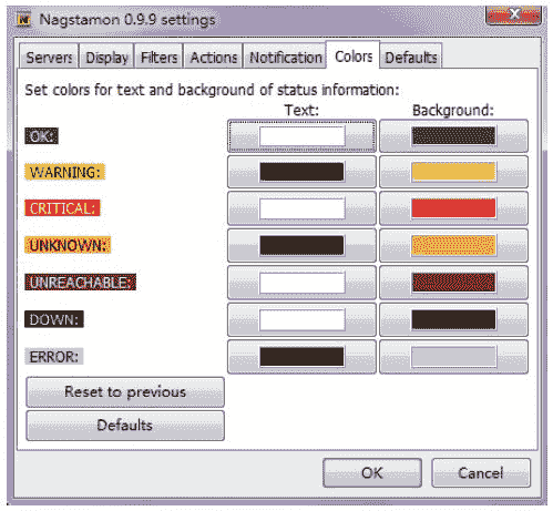 最后一个标签是“Colors”,如图 8-86 所示,这个标签用于设置监控状态的显示颜色,在默认情况下,OK 状态显示绿色,WARNING 状态显示黄色,CRITICAL 状态显示红色,UNKNOWN 状态显示橙色,而 UNREACHABLE 状态显示棕色,DOWN 状态则以黑色表示。