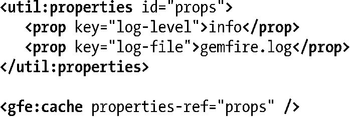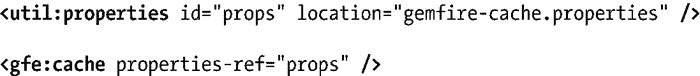 注意使用 Spring 的 util 命名空间创建 Properties 对象的方法。这跟 Spring 的属性占位符机制有关系但是又不相同,它使用基于 token 的替换方式,使得可以通过各种来源在外部定义任意 Bean 里的属性。此外,cache 元素包含 cache-xml-location 属性,可以使用 GemFire 的内置配置模式来设置缓存。如前所述,这些主要是由历史遗留原因造成的。