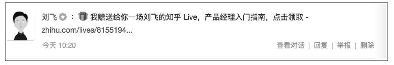 这个功能的使用,是 Live 主可以在自己的 Live 页面下点选“送票”按钮,然后选择要赠送的对象,于是,对方就会收到一条私信。比如知乎大 V 刘飞给我赠送了一场他的 Live,我收到的私信如图 2-26 所示。