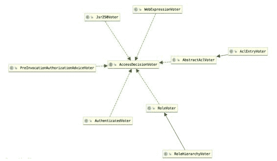 - AbstractAclVoter:基于 ACL 进行权限控制时的投票器。这是一个抽象类,没有绑定到具体的 ACL 系统(关于 ACL,本书第 14 章会做详细介绍)。