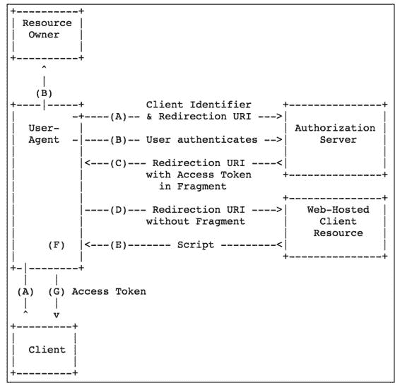 对于这种没有后端,只有页面的网站,如果想接入 GitHub 第三方登录功能,该怎么办呢?这就是本小节要介绍的简化模式(Implicit),图 15-3 所示表示简化模式的工作流程(图片来自 RFC6749 文档)。