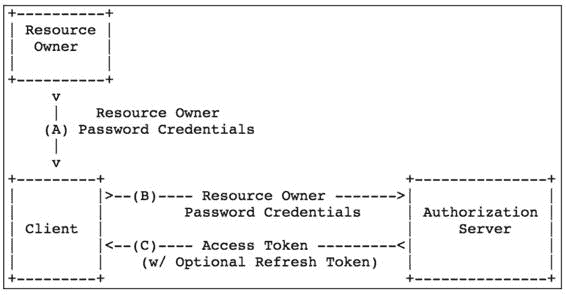 使用密码模式(Password)有一个前提就是高度信任第三方应用,只有高度信任第三方应用,才可以让用户在第三方应用的页面上输入登录凭证。我们来看一下密码模式的流程,如图 15-4 所示(图片来自 RFC6749 文档)。