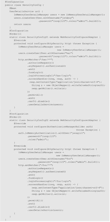在 SecurityConfig 中分别定义两个静态内部类 SecurityConfig01 和 SecurityConfig02,两个配置类都继承自 WebSecurityConfigurerAdapter,可以分别配置一条过滤器链。