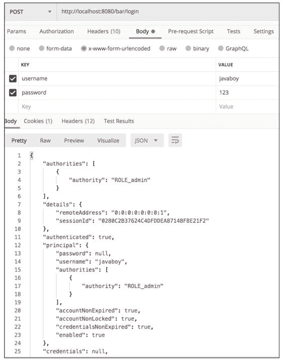 先来看 Security01。在 Security01 中,我们设置过滤器链的拦截规则是/bar/**,即如果请求路径是/bar/**格式的,则进入到 Security01 的过滤器链中进行处理。同时我们配置了局部 AuthenticationManager 对应的用户是 bar/123,由于没有重写 configure(Authentication ManagerBuilder) 方法,所以注册到 Spring 容器中的 UserDetailsService 将作为局部 Authentication Manager 的 parent 对应的用户。换句话说,如果登录的路径是/bar/login,那么开发者可以使用 bar/123 和 javaboy/123 两个用户进行登录。登录效果如图 4-8 所示(注意登录路径是/bar/login)。