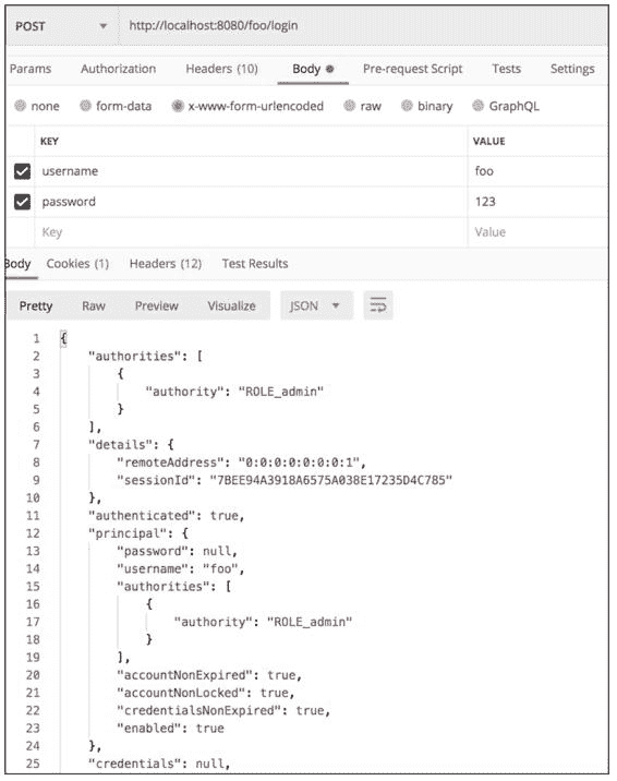 再来看 SecurityConfig02。在 Security02 中,我们设置过滤器链的拦截规则是/foo/**,即如果请求路径是/foo/**格式的,则进入到 Security02 的过滤器链中进行处理,同时我们配置了局部 AuthenticationManager 对应的用户是 foo/123,由于重写了 configure(Authentication ManagerBuilder) 方法,在该方法中定义了局部 AuthenticationManager 的 parent 对应的用户,此时注册到 Spring 容器中的 UserDetailsService 实例对于/foo/**过滤器链不再生效。换句话说,如果登录路径是/foo/login,开发者可以使用 foo/123 和 javagirl/123 两个用户进行登录,而不可以使用 javaboy/123 进行登录。登录效果如图 4-9 所示(注意登录路径是/foo/login)。