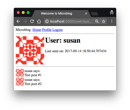 事实上,我在存储时间和在个人主页显示时间的时候,使用的都是 UTC 时区。 除此之外,显示的时间格式也可能不是你所预期的,因为实际上它是 Python datetime 对象的内部表示。 现在,我不会操心这两个问题,因为我将在后面的章节中讨论在 Web 应用中处理日期和时间的主题。