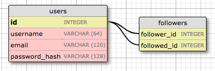 followers 表是关系的关联表。 此表中的外键都指向用户表中的数据行,因为它将用户关联到用户。 该表中的每个记录代表关注者和被关注者的一个关系。 像学生和老师的例子一样,像这样的设计允许数据库回答所有关于关注和被关注的问题,并且足够干净利落。