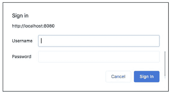 通过 httpBasic() 方法即可开启 HTTP 基本认证。配置完成后,启动项目,此时如果需要访问一个受保护的资源,浏览器就会自动弹出认证框,如图 10-2 所示。输入用户名/密码完成认证之后,就可以访问受保护的资源了。