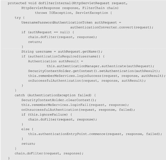 HttpBasicConfigurer 类的 configure 方法中,向 Spring Security 过滤器链添加一个过滤器 BasicAuthenticationFilter,该过滤器专门用来处理 HTTP 基本认证相关的事情,我们来看一下它核心的 doFilterInternal 方法: