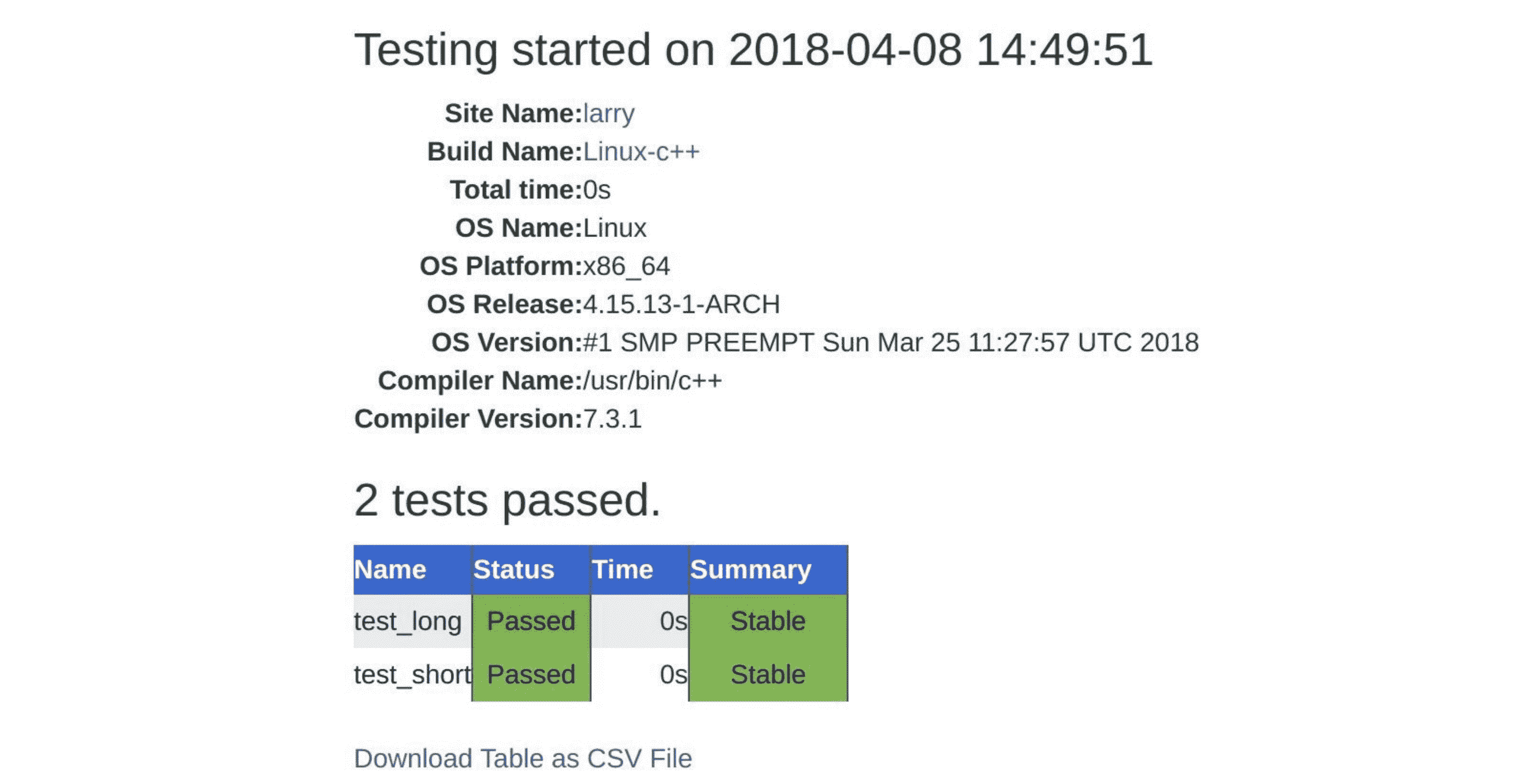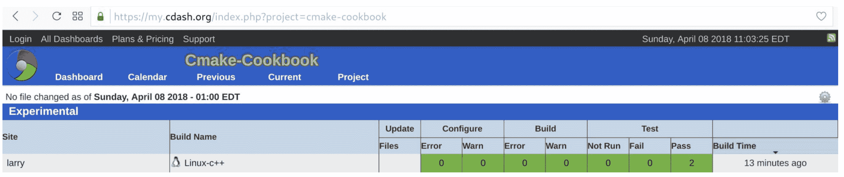 $ ctest --dashboard Experimental Site: larry Build name: Linux-c++ Create new tag: 20180408-1449 - Experimental Configure project Each . represents 1024 bytes of output . Size of output: 0K Build project Each symbol represents 1024 bytes of output. '!' represents an error and '*' a warning. . Size of output: 0K 0 Compiler errors 0 Compiler warnings Test project /home/user/cmake-recipes/chapter-15/recipe-01/cxx-example/build Start 1: test_short 1/2 Test #1: test_short ....................... Passed 0.00 sec Start 2: test_long 2/2 Test #2: test_long ........................ Passed 0.00 sec 100% tests passed, 0 tests failed out of 2 Total Test time (real) = 0.01 sec Performing coverage Cannot find any coverage files. Ignoring Coverage request. Submit files (using http) Using HTTP submit method Drop site:http://my.cdash.org/submit.php?project=cmake-cookbook Uploaded: /home/user/cmake-recipes/chapter-14/recipe-01/cxx-example/build/Testing/20180408-1449/Build.xml Uploaded: /home/user/cmake-recipes/chapter-14/recipe-01/cxx-example/build/Testing/20180408-1449/Configure.xml Uploaded: /home/user/cmake-recipes/chapter-14/recipe-01/cxx-example/build/Testing/20180408-1449/Test.xml Submission successful