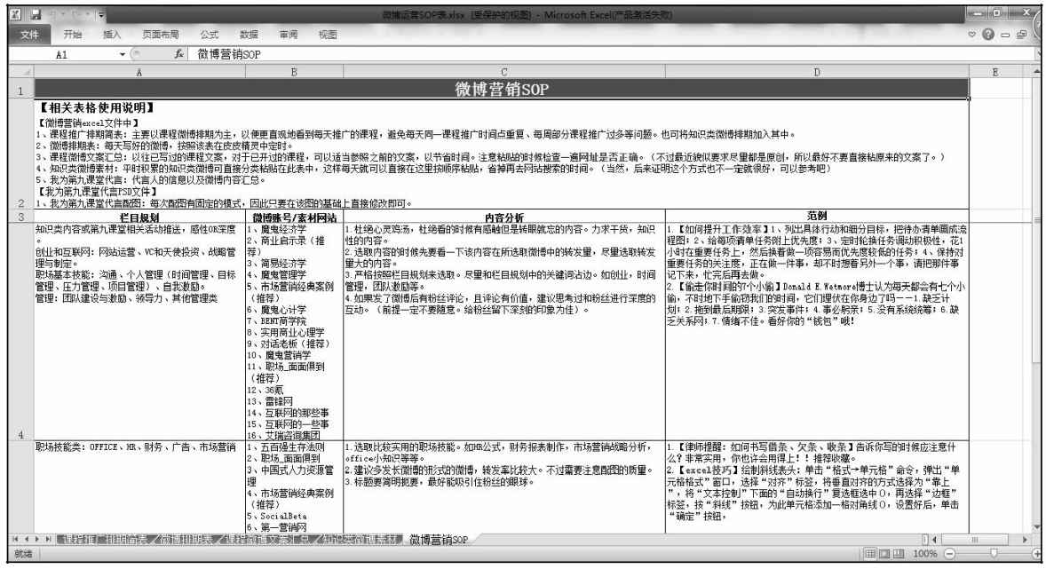 有点看不清?别着急,我们慢慢放大一点来看:你会发现,首先,他有一个自己工作的 SOP(标准工作步骤),比如在“微博营销 SOP”这个表里的内容如图 2-11 所示。