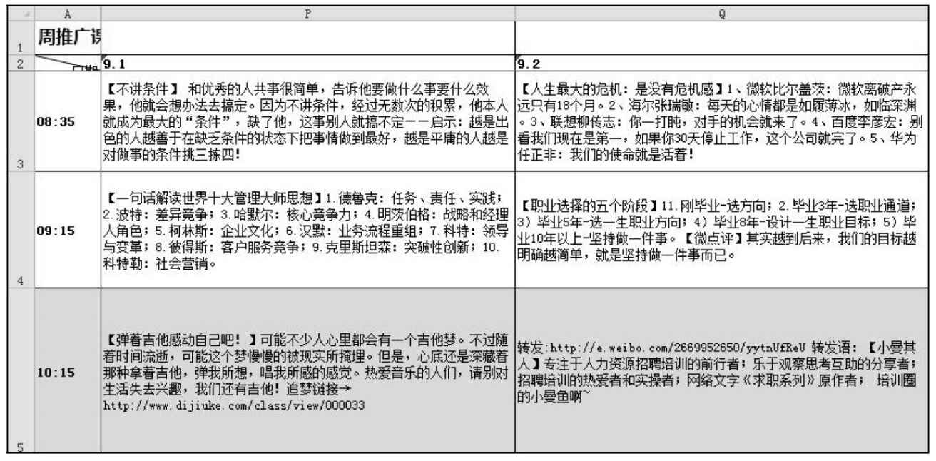 图 2-12 是他的另一个表,叫作“微博排期表”,他在这里面把一周内这个微博所有要发布的内容排期都已经全部做好了,发布时间精准到分钟。