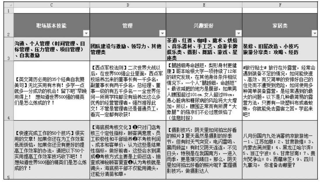 还有这个表(图 2-13):知识类微博素材。他把自己收集到的所有知识类微博素材都放进了这个表里,然后这里就成了他的弹药库。