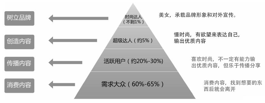 你会发现,在这个生态中,美丽说把自己的用户分成了时尚达人、超级达人、活跃用户和需求大众 4 类,其中时尚达人承载品牌树立作用,超级达人主要生产和创造内容,活跃用户主要会加速优质内容的传播,而需求大众则主要是消费内容的。