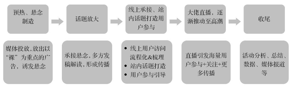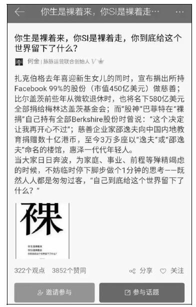 围绕着“知识裸捐”营造出一个话题,先通过“裸”和“裸”引发的悬念来吸引眼球引发关注+传播,再通过站内话题的打造带动大家对于“知识裸捐”这一行为的共鸣和参与,最后通过王小川、江南春等一系列圈内大佬、大 V 们的在线直播讲座来让活动进入高潮,并最终进一步放大活动影响力。