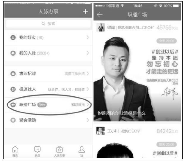 直到又认真地看了 3 分钟后,她才终于在“人脉办事”中找到了“职播广场”,并点击进入其中,这才找到了相关的内容,如图 2-24 所示。