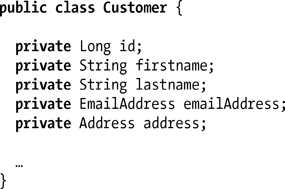 我们选取领域模型中的 Customer 领域类,它会被持久化到任意的存储之中。这个类应该如示例 2-1 所示。