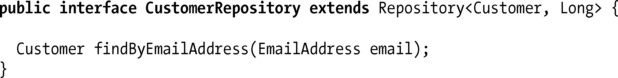CustomerRepository 接口建立之后,我们就可以继续深入学习并添加一些易于声明的查询方法。常见的需求是通过电子邮件地址来获取 Customer。为了做到这一点,我们添加合适的查询方法,如示例 2-6 所示。