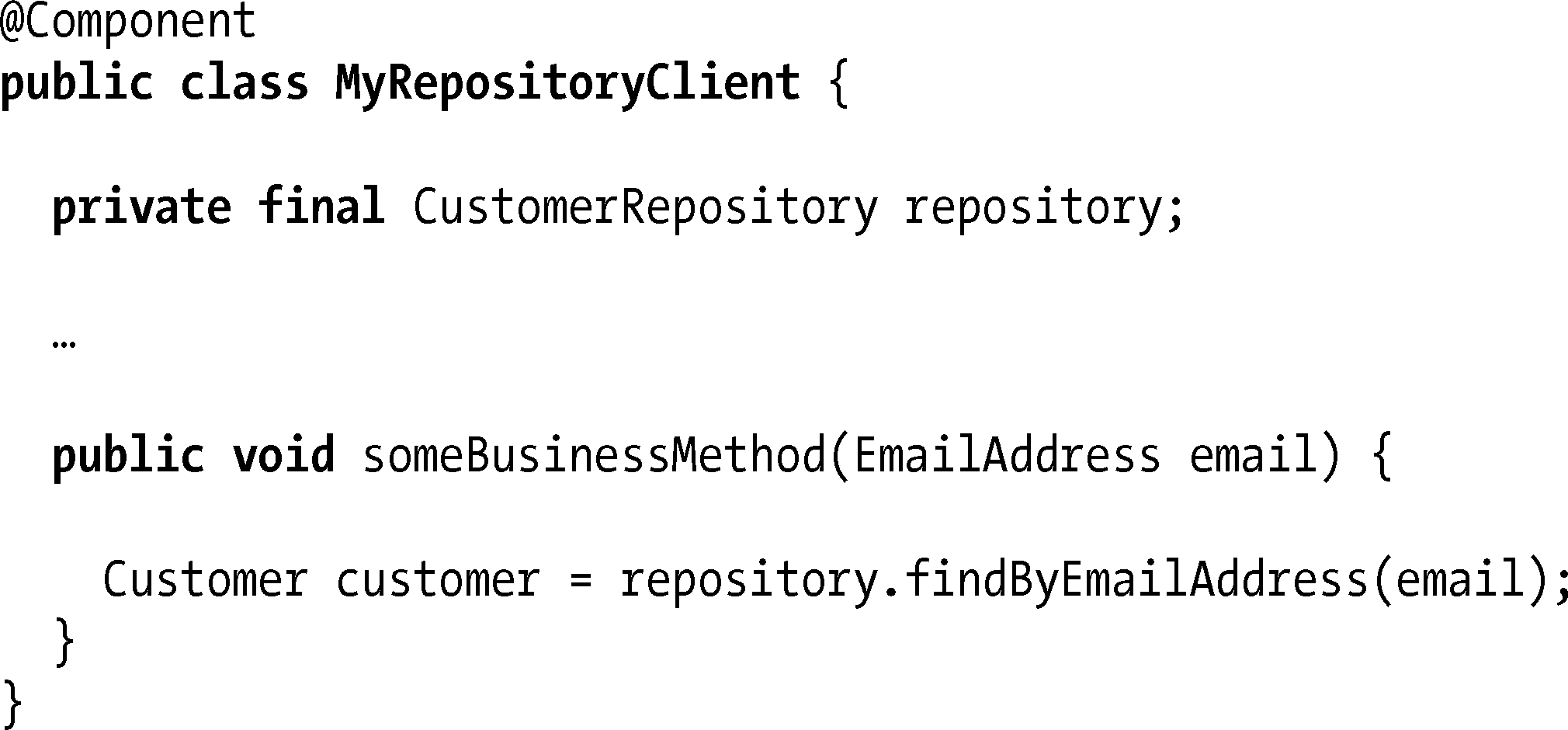 在示例 2-6 中,由于我们遵循了领域对象属性的命名约定,因而查询可以衍生得到。查询方法名中的 EmailAddress 部分其实就对应了 Customer 类的 emailAddress 属性,因此,在使用 JPA 模块时,Spring Data 会自动为声明的方法衍生出 select C from Customer c where c.emailAddress = ?1。它还会检查方法声明中属性引用的合法性,如果发现任何错误则会在容器启动时,出现启动失败。现在,客户端可以很容易地执行这个方法,给定的方法参数会绑定到根据方法名衍生出来的查询之中并且执行该查询,如示例 2-7 所示。