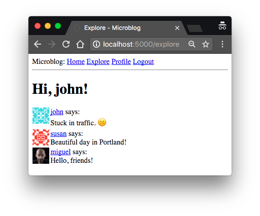 你有没有注意到这个视图函数中的奇怪之处? render_template() 引用了我在应用的主页面中使用的 index.html 模板。 这个页面与主页非常相似,所以我决定重用这个模板。 但与主页不同的是,在发现页面不需要一个发表用户动态表单,所以在这个视图函数中,我没有在模板调用中包含 form 参数。