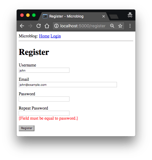 由于这是一个注册表单,习惯上要求用户输入密码两次,以减少输入错误的风险。 出于这个原因,我提供了 password 和 password2 字段。 第二个 password 字段使用另一个名为 EqualTo 的验证器,它将确保其值与第一个 password 字段的值相同。
