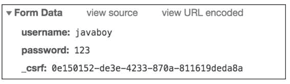 这个就是请求额外携带的 CSRF 令牌参数。在前面的章节中,我们在配置 HttpSecurity 时总是加上一句.csrf().disable(),表示关闭 CSRF 攻击防御功能,因此请求参数中就没有 CSRF 令牌。如果我们什么都不配置,默认 CSRF 攻击防御就是开启的,登录参数中就自动存在_csrf 参数。