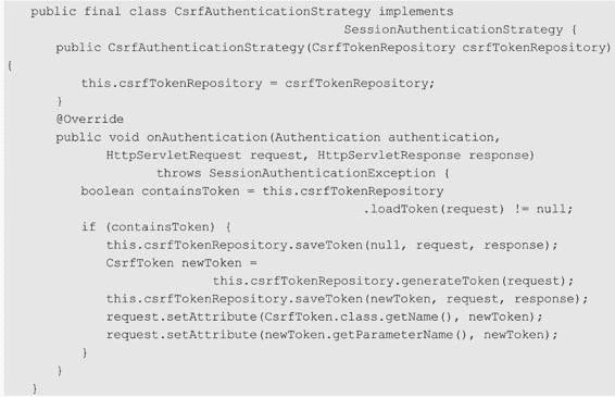 CsrfAuthenticationStrategy 实现了 SessionAuthenticationStrategy 接口,默认也是由 CompositeSessionAuthenticationStrategy 代理执行,在用户登录成功后触发执行,具体可以参考 7.2.2.3 小节。