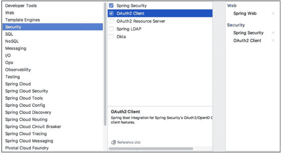 创建一个 Spring Boot 项目,引入 Web、Spring Security 以及 OAuth2 Client 依赖,如图 15-9 所示。
