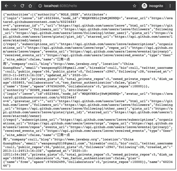 所有工作都完成后,最终会自动跳转回 http://localhost:8080/hello 页面,在该页面可以看到用户登录成功后的信息,如图 15-11 所示。