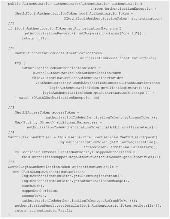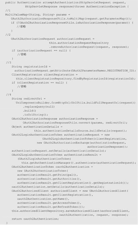 注释 4 是构造一个未经认证的 OAuth2LoginAuthenticationToken 对象,并调用 authenticate 方法进行认证。认证成功后,最终封装成一个 OAuth2AuthenticationToken 对象并返回。这一块读者可以回顾本书 3.1.4 小节的分析,流程都是一样的,只是实现细节有所差异而已。需要注意的是,这里认证时调用的 AuthenticationProvider 是 OAuth2LoginAuthenticationProvider。