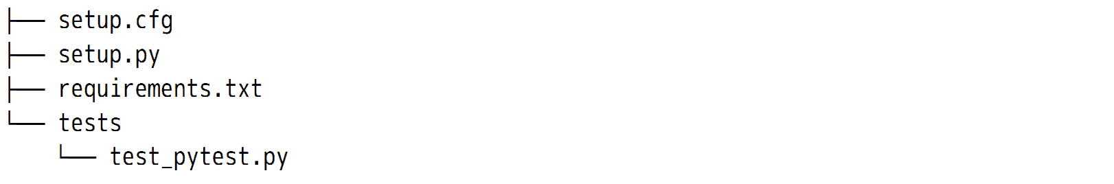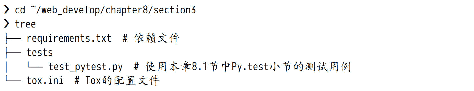 其中 test_pytest.py 使用 8.3 节的测试代码。setup.cfg 是 INI 格式的配置文件,可以把支持的命令的默认设置放入这个配置文件中,而不需要在命令行指定: