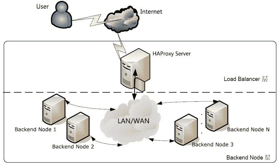 - Backend Node 层:由一组实际运行应用服务的机器组成。Backend Node 可以是 Web 服务器、Mail 服务器、FTP 服务器、DNS 服务器、视频服务器中的一个或多个,每个 Backend Node 之间通过高速的 LAN 或分布在各地的 WAN 相连接。在实际的应用中,HAProxy Server 也可以同时兼任 Backend Node 的角色。