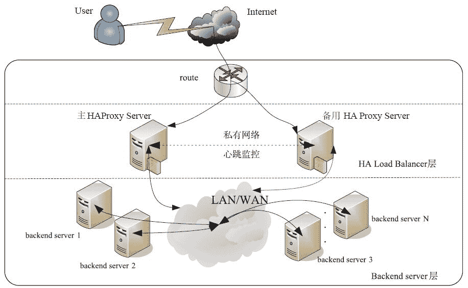 虽然 HAProxy Server 具有高负荷工作的能力,但是对于一个健壮的集群系统来说,单点故障是绝对不允许的。要避免这种单点故障,最实用、最简单的办法就是对 HAProxy Server 进行高可用集群,常见的方案就是为 HAProxy Server 做一个双机热备:在正常状态下主 HAProxy Server 工作,备用 HAPproxy Server 监控主 HAProxy Server 的状态,当主 HAProxy Server 出现异常或者故障时,备用 HAProxy Server 马上接过主 HAProxy Server 的工作,负责对用户请求进行分发处理,这样就避免了一台 HAProxy Server 的单点故障问题,保证了负载均衡端持续地提供服务。