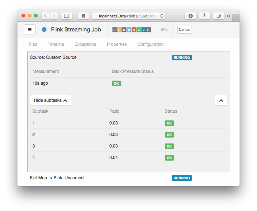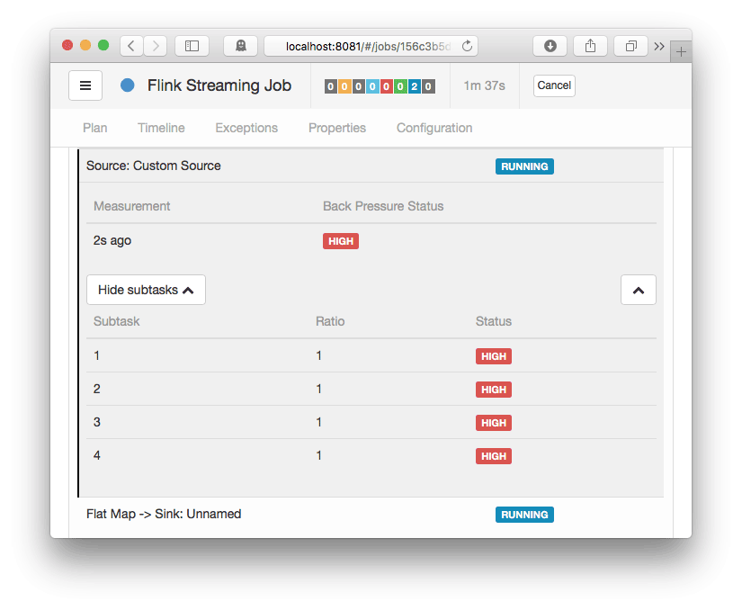 如果您看到任务的状态 正常 ,则表示没有背压指示。另一方面, HIGH 意味着任务被加压。