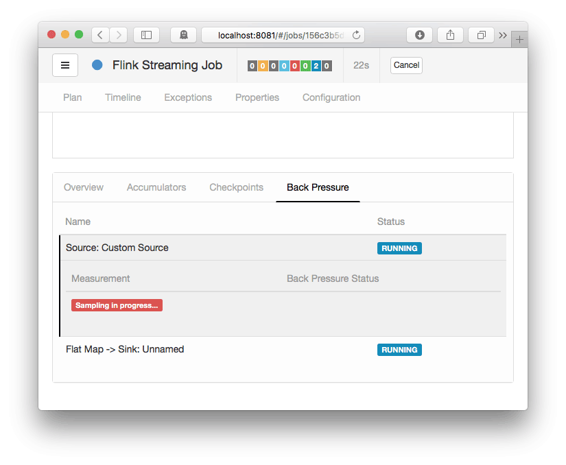 这意味着 JobManager 触发了正在运行的任务的堆栈跟踪示例。使用默认配置,大约需要 5 秒钟才能完成。