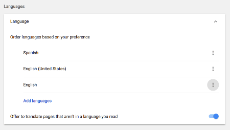 在为西班牙语或任何其他添加到项目中的语言创建 messages.mo 文件之后,可以在应用中使用这些语言。 如果你想查看应用程序以西班牙语显示的方式,则可以在 Web 浏览器中编辑语言配置,以将西班牙语作为首选语言。 对 Chrome,这是设置页面的高级部分: