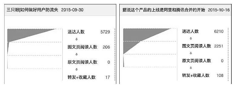 图 3-42 是我们 2015 年 10 月前后,通过三节课的微信公众号推送出去的两篇文章,你可以看到,同样的推送渠道,仅仅只是标题的差异,这两篇文章之间的阅读量差了整整 10 倍!