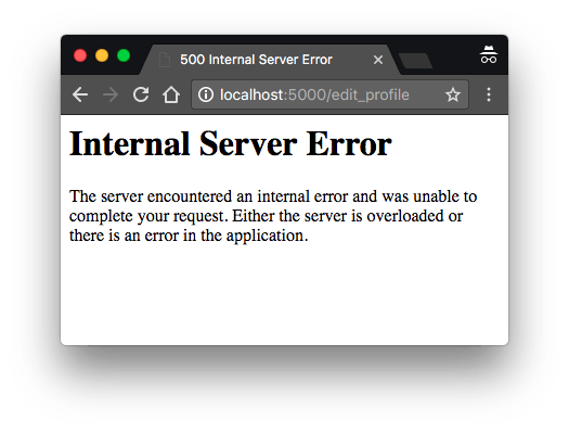 在 Flask 应用中爆发错误时会发生什么? 得到答案的最好的方法就是亲身体验一下。 启动应用,并确保至少有两个用户注册,以其中一个用户身份登录,打开个人主页并单击“编辑”链接。 在个人资料编辑器中,尝试将用户名更改为已经注册的另一个用户的用户名,boom!(爆炸声) 这将带来一个可怕的“Internal Server Error”页面: