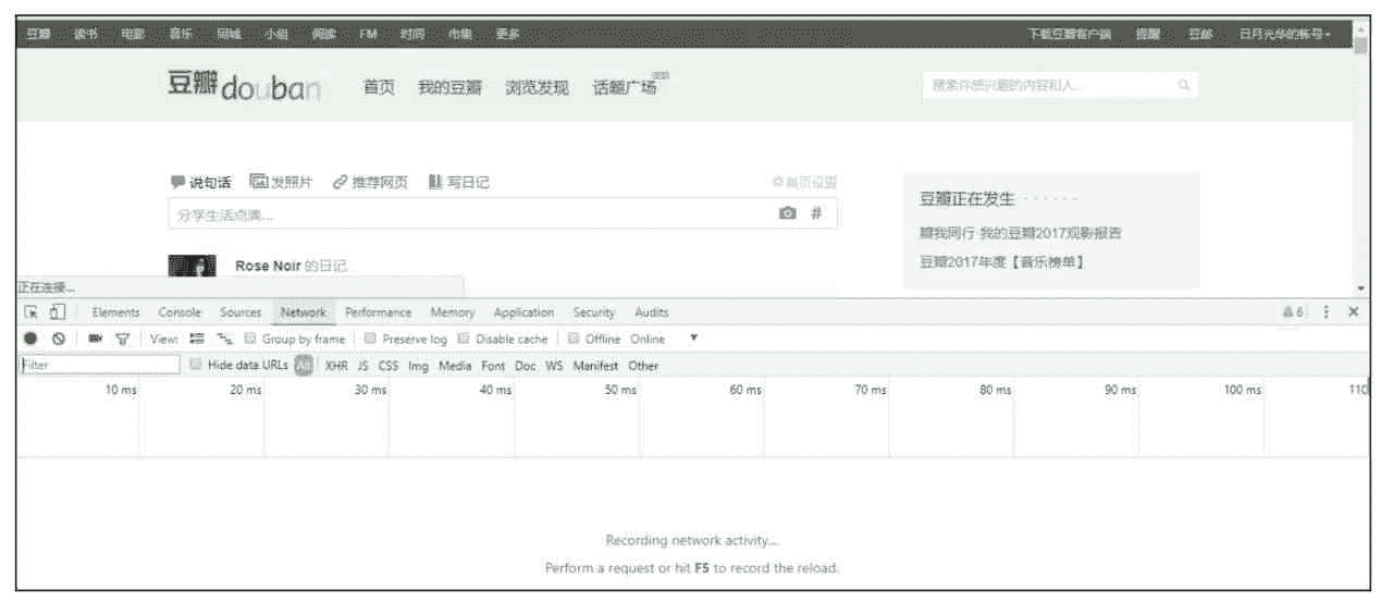 首先打开豆瓣的首页,输入用户名和密码并单击“登录豆瓣”。在登录后的网站空白处单击右键,在弹出的菜单中选择“检查”,然后在下方(或右侧)弹出的检查页面顶部菜单中选择 Network,如图 5-1 所示。