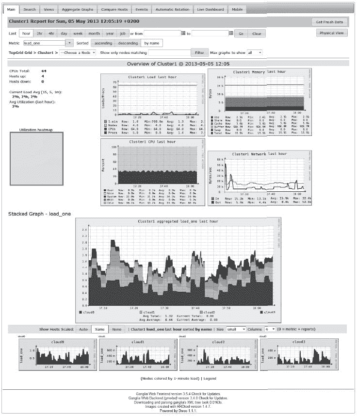 最后,将 Apache/PHP 的 Web 服务启动,就可以查看 Ganglia 收集到的所有节点的监控数据信息。图 7-4 是 Ganglia Web 某一时刻的运行状态图。