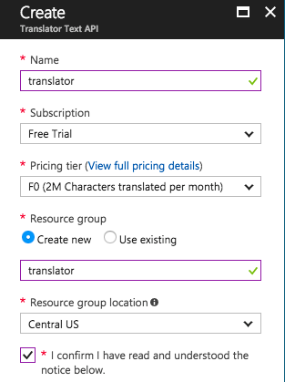 获得 Azure 帐户后,转到 Azure 门户并单击左上角的“New”按钮,然后键入或选择“Translator Text API”。 当你点击“Create”按钮时,将看到一个表单,并可以在其中定义一个新的翻译器资源,然后将其添加到你的帐户中。 你可以在下面看到我是如何完成表单的: