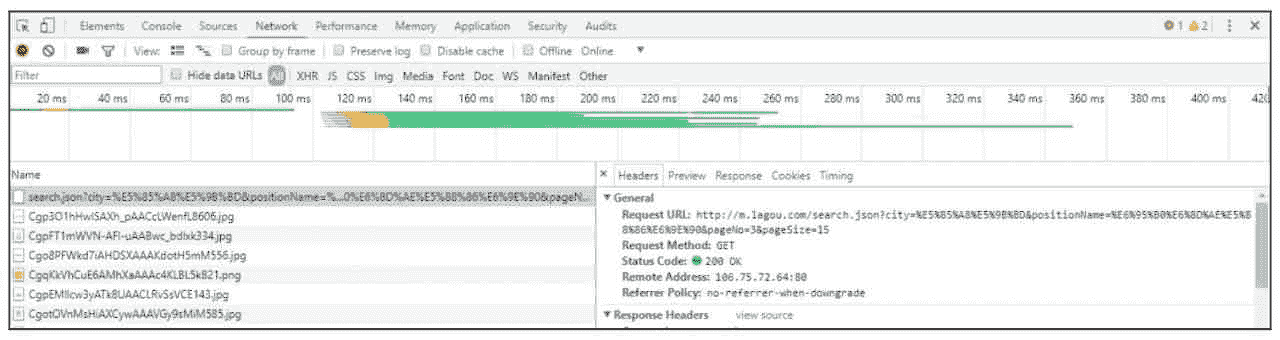 从 8-4 图中可以看到 Request URL 为 http://m.lagou.com/search.json?city= %E5%85%A8%E5%9B%BD&positionName=%E 6%95%B0%E6%8D%AE%E5%88%86%E6%9E%90&pageNo=3&pageSize=15。