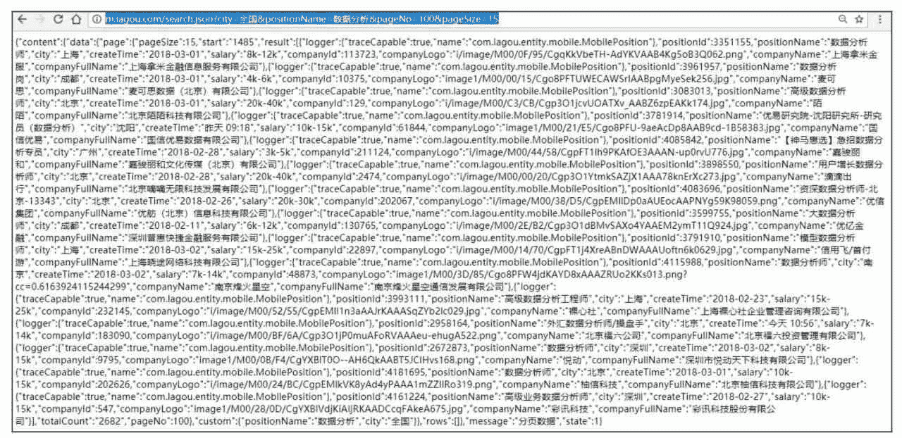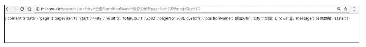 改变 pageNo 的值,查看一下能否得到对应页的数据。例如,查看第 100 页(http://m.lagou.com/search.json?city=%E5%85%A8%E5%9B%BD&positionName=%E 6%95%B0%E6%8D%AE%E5%88%86%E6%9E%90&pageNo=100&pageSize=15)。
