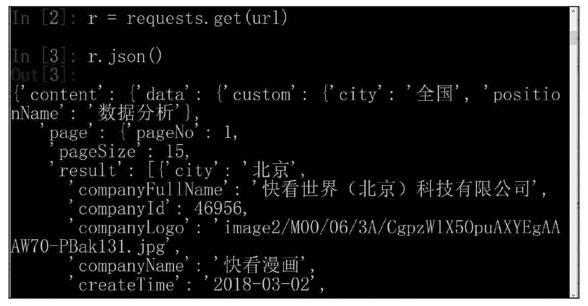 上面对招聘岗位列表页面的分析有一个问题需要解决,那就是打开构造的请求网址返回的是 json 数据。前面我们并没有演示返回 json 数据的处理方法。幸运的是,对于网站返回 json 数据,Requests 中有一个内置的 json 解码器,可以帮助处理 json 数据。下面请求第一页试试。