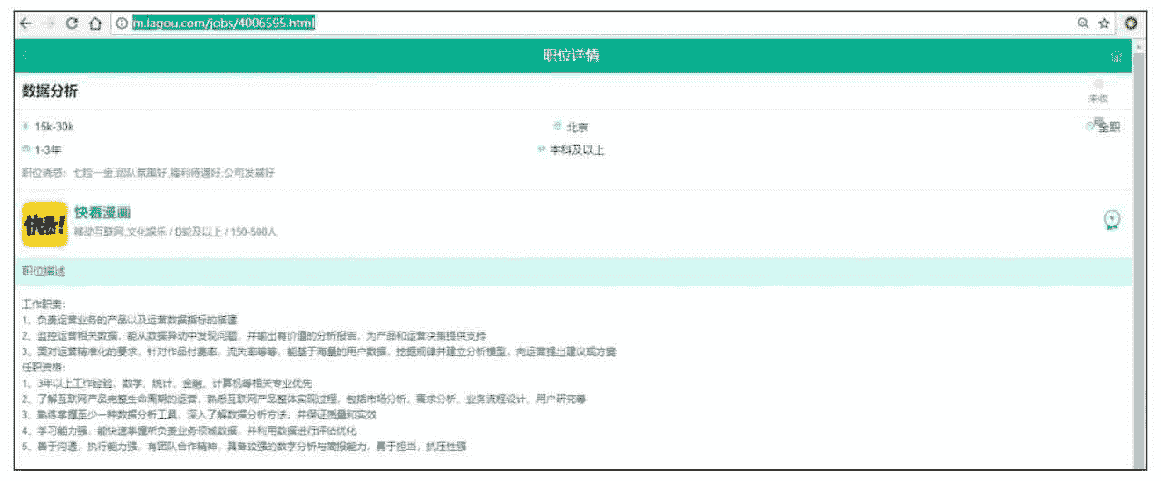 可以看到它的 URL 为 http://m.lagou.com/jobs/4006595.html。其关键就是最后的数字 id,通过与列表页中解析出的数据对比,不难发现这个数字 id 就是招聘列表页面中职位的 positionId 的值。由此可见,通过解析招聘列表页面中招聘职位的 positionId 的值,构造成招聘职位详情页的 URL,然后请求这个地址,就可以解析出学历、工作经验及岗位职责等信息。