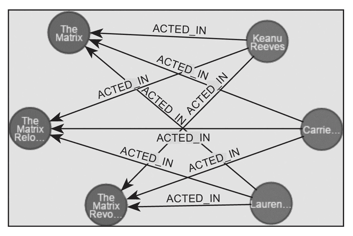 这时,在数据库客户端的控制台上,单击左面侧边栏的关系类型 ACTS_IN,可以看到一个很酷的图形,图中每部电影和每个演员是一个节点,节点的每条有向边代表了这个演员在那部电影中扮演的角色,如图 2-7 所示。