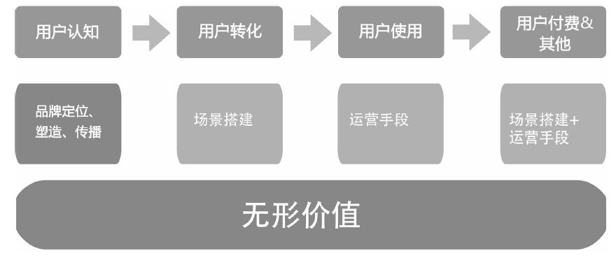 在以上这些环节中,通常“用户认知”这个环节下的品牌传播、塑造、定位,加上产品“无形价值”的塑造,基本会是一家互联网公司的市场部更应该关注的工作。