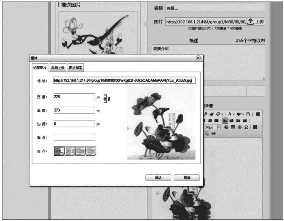 使用 Ueditor 上传图片的效果如图 7-3 所示。图片上传后,选择图片,单击富文本编辑器中的上传图片按钮,可以查看上传图片的简要信息。