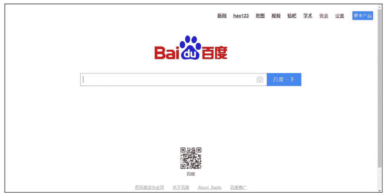 这节用一个抓取百度首页的例子让读者深入理解 Requests 库和 XPath 语法知识,同时,通过这个例子讲解 Chrome 浏览器的检查工具。之所以选择抓取百度首页,是因为这个页面相对简单,非常有利于初学者理解下载网页、提取数据的整个过程。图 3-1 所示为百度首页页面。