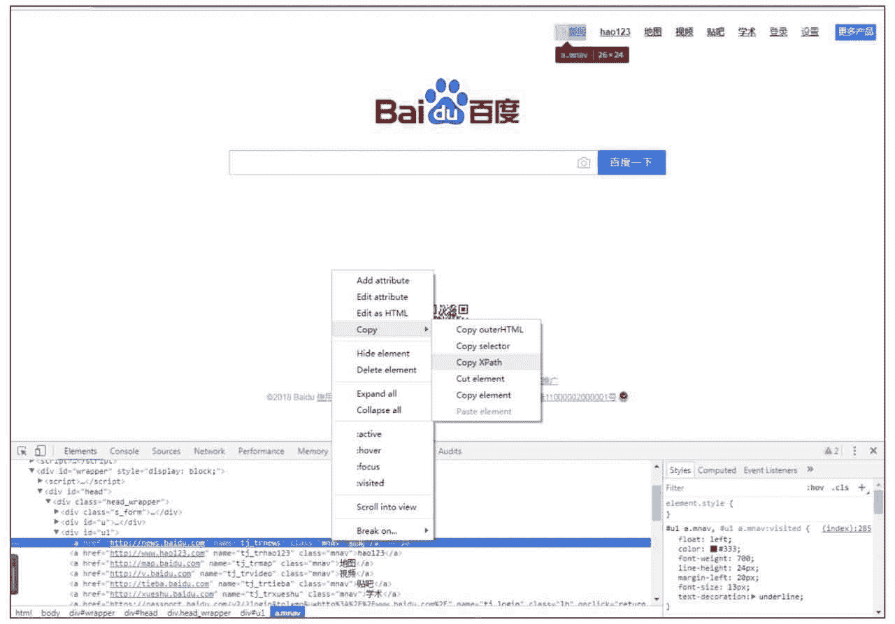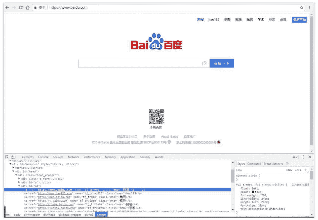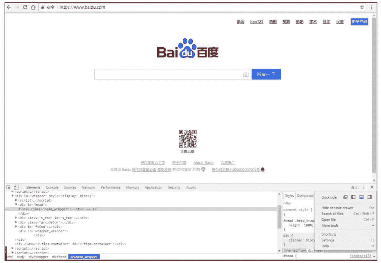 etree 提供了 HTML 这个解析函数,使得可以直接对 HTML 源码使用 XPath 语法查找。下面需要分析网页中要提取元素的 XPath 路径,可以使用 Chrome 浏览器帮助编写 XPath 路径。在百度页面空白处单击右键,在弹出的菜单中选择“检查”,页面下方弹出一个子页面(也可能出现在页面右边,可以通过单击子页面右上角竖着的 3 个点图标,以更改显示的位置),如图 3-2 所示。